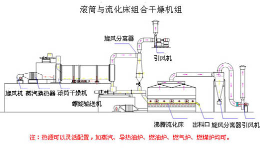 設(shè)備原理: 干燥時(shí),濕物料通過加料器進(jìn)入滾筒干燥機(jī)內(nèi),被機(jī)內(nèi)的操板不斷翻動(dòng)、打散,并與熱空氣充分地接觸,物料中的水分被快速蒸發(fā),使較粘的物料變成流動(dòng)性較好的松散物料。物料通過輸料裝置進(jìn)入沸騰流化床中。在流化床中,物料受到較長時(shí)間的流化干燥,從而保證了物料的干燥質(zhì)量。